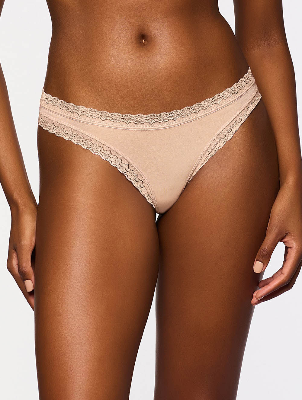 Calcinha fio confeccionada em modal com elastano e detalhe de acabamento com renda estreita com desenho floral.