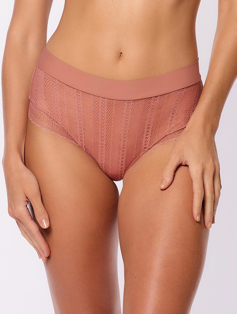 Calcinha cavada em renda com forro e cós duplo em microfibra. Modelagem confortável para quem busca calcinhas com ampla cobertura na parte posterior.