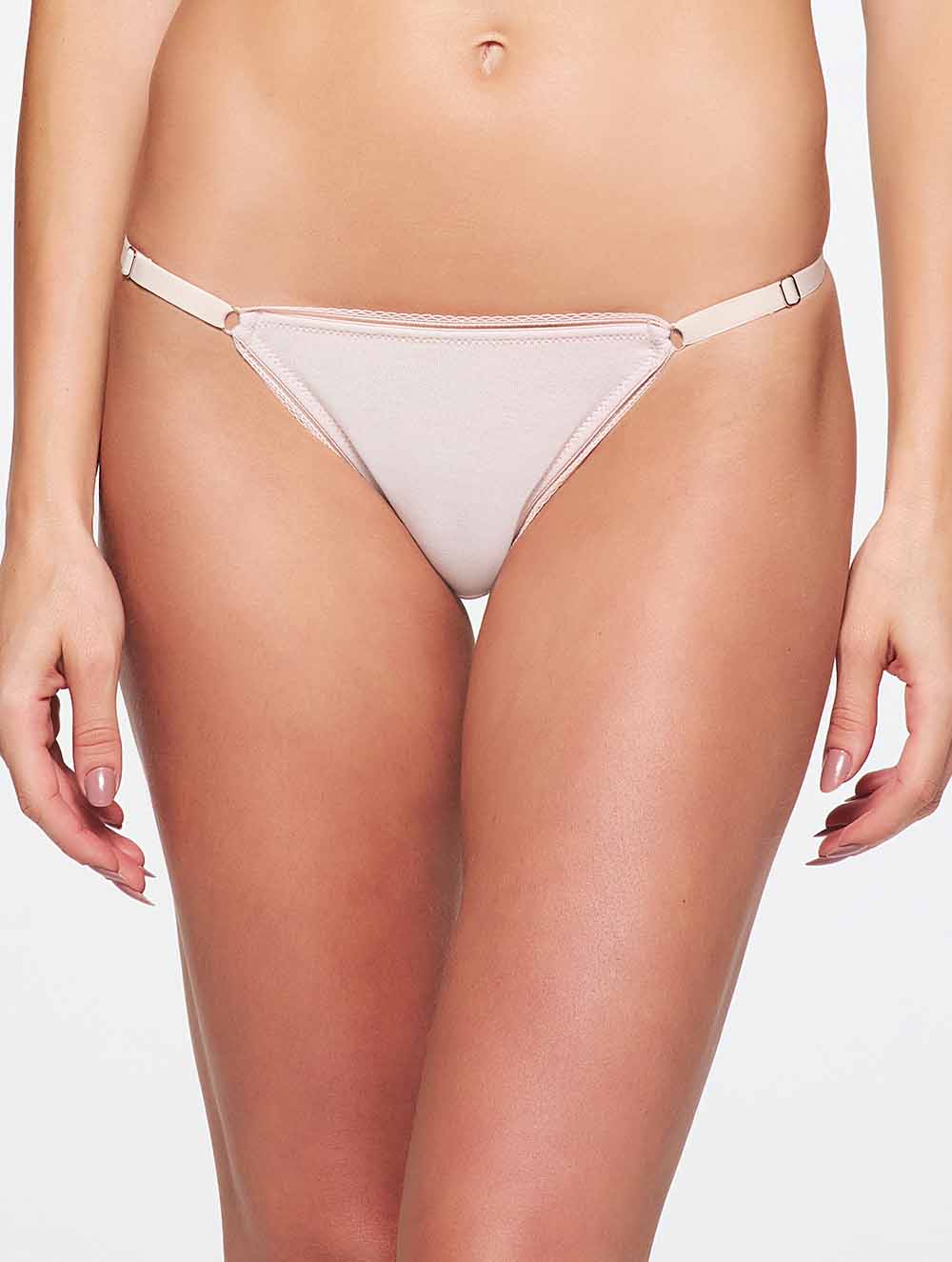 Calcinha modelo string fio dental, possui laterais em elástico com regulagem e frente e bumbum duplo.