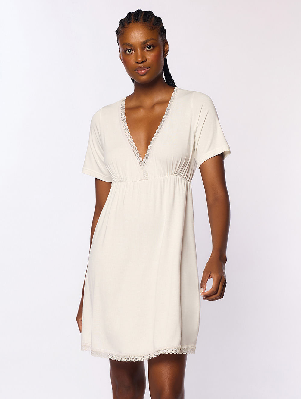 Camisola com manga curta, confeccionada em modal, possui decote transpassado em V com detalhe de renda estreita aplicada e elástico abaixo do busto.