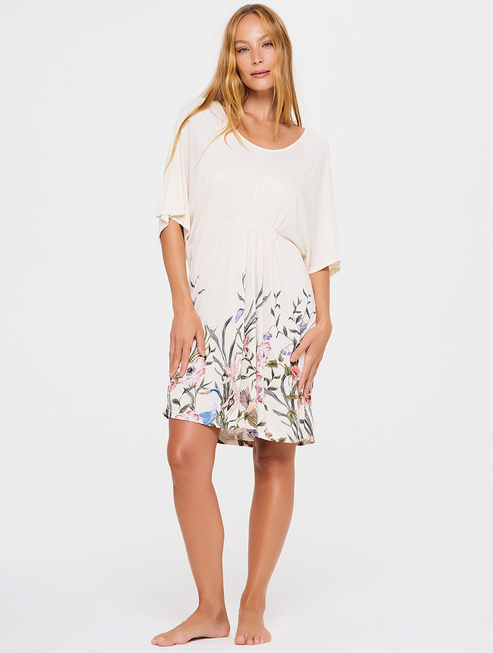 Camisola curta estampada. Possui decote em U, detalhe de franzido abaixo do busto, estampa floral em cores contrastantes e caimento leve.