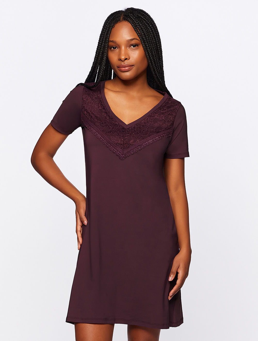 Camisola curta confeccionada em microfobra de poliamida com elástano, possui mangas curtas e decote em V com renda e laise aplicadas.