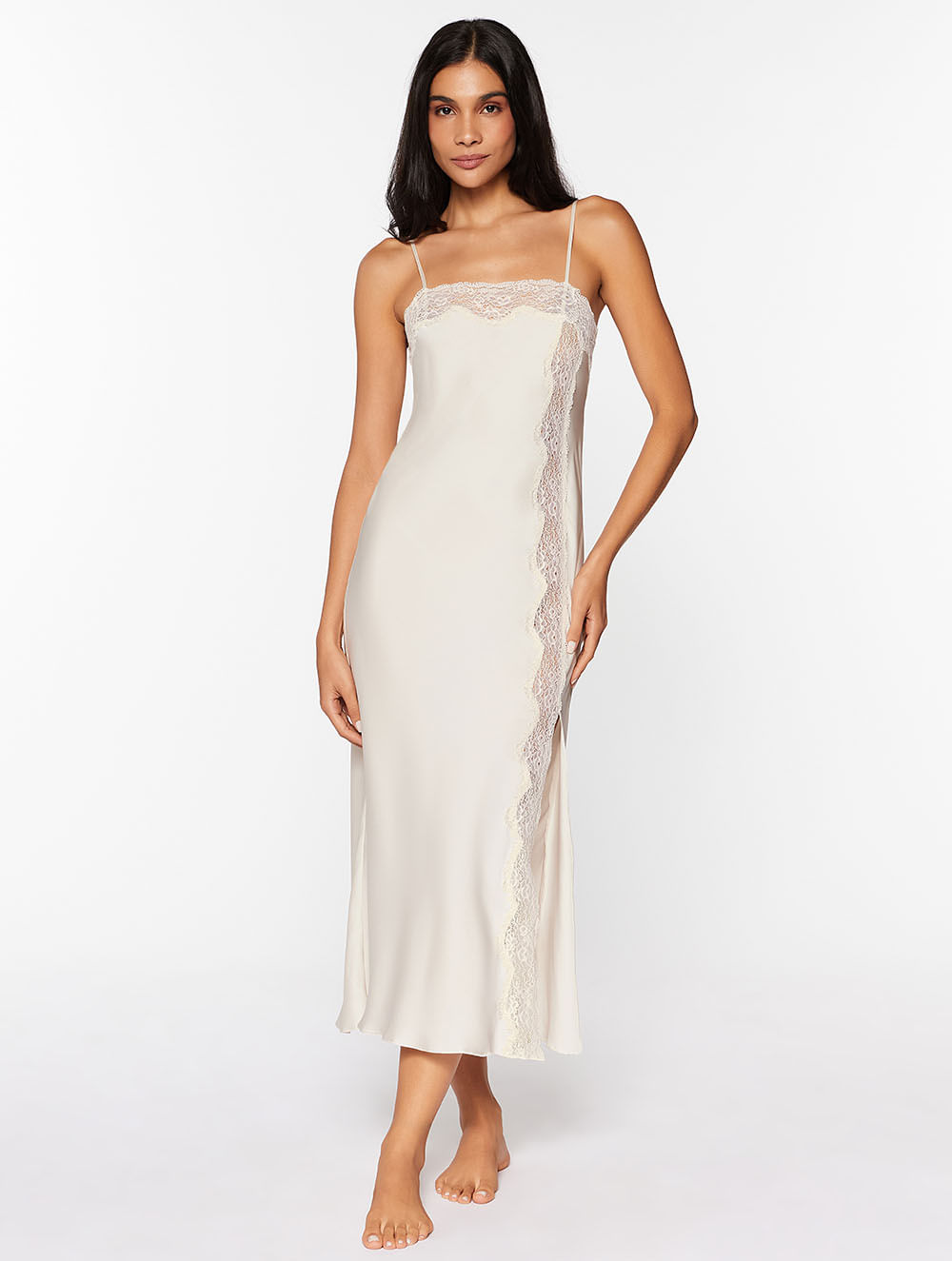 Camisola midi confeccionada em cetim, possui caimento evasê, alças finas com regulagem, decote reto com renda recortada aplicada. O recorte de renda vazada na lateral da peça possui abertura de fenda.