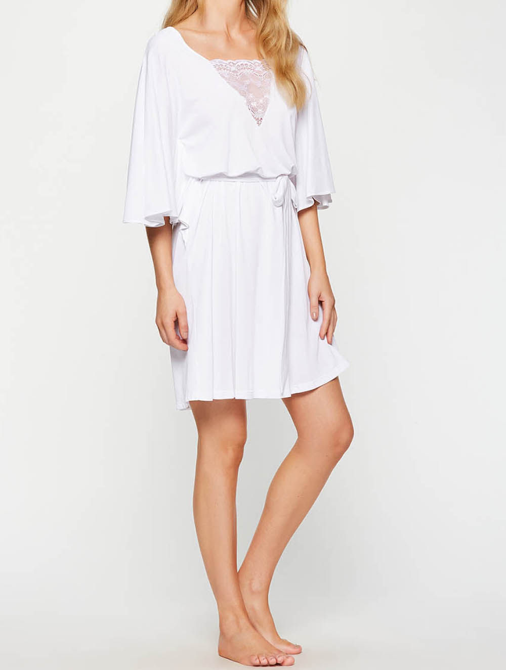 Kaftan curto com mangas amplas e curtas, faixa para amarração na cintura e recorte de renda vazada no decote.