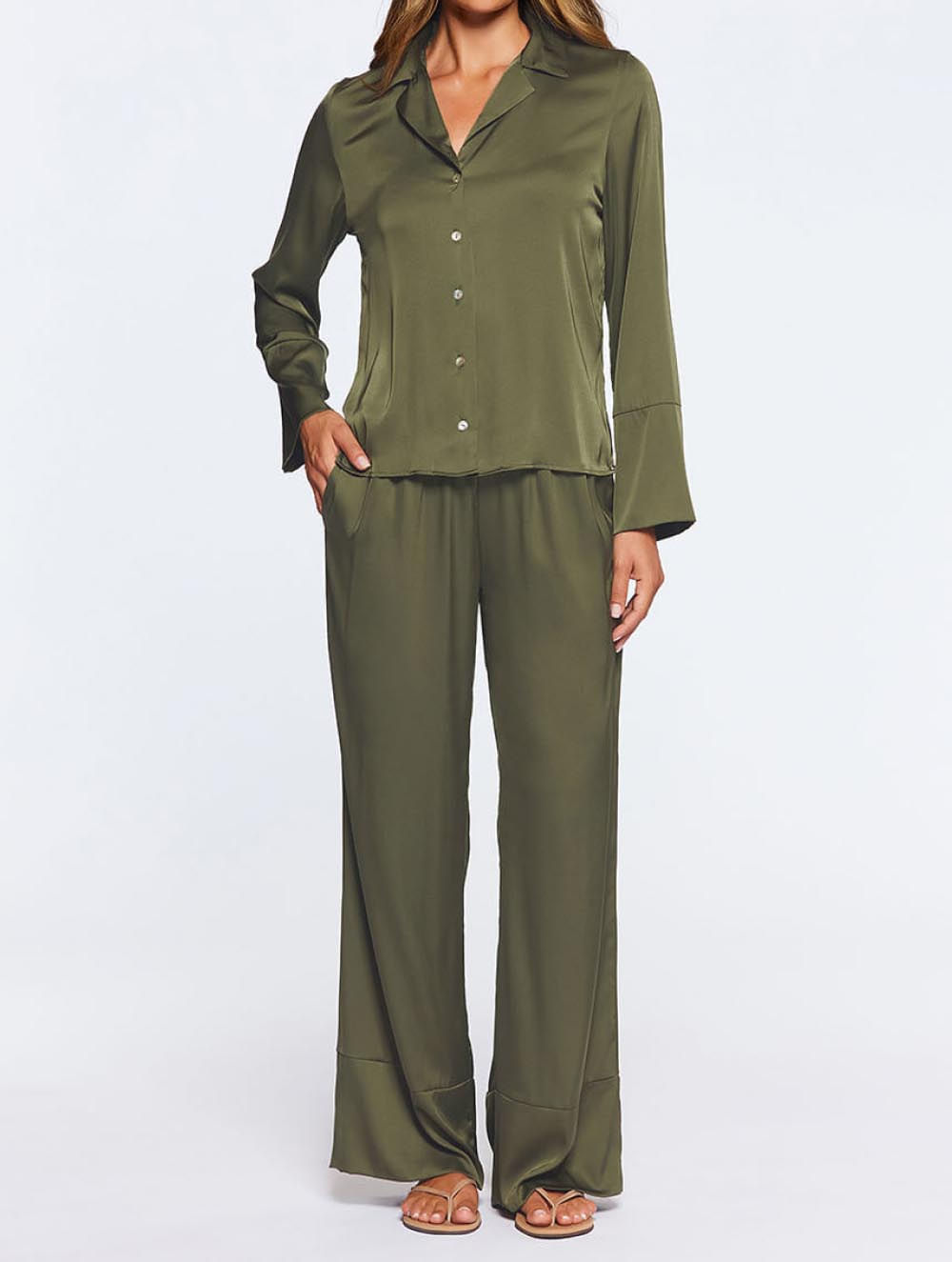 Pijama confeccionado em cetim, com camisa manga longa com punhos