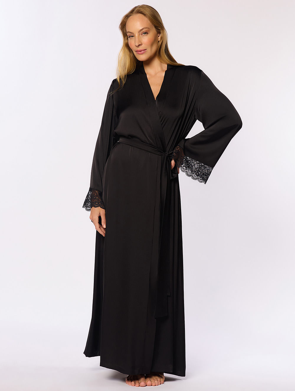 Robe confeccionado em cetim com sofisticado comprimento longo, manga longa, aplicação em renda na barra da manga, que oferecem um charme, e faixa solta para amarração.