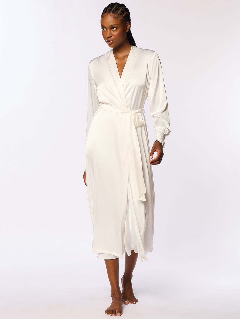 Robe confeccionado em cetim, com gola xale, um sofisticado comprimento midi, manga longa, punhos com detalhes em lastex que oferecem um charme, e faixa solta para amarração.
