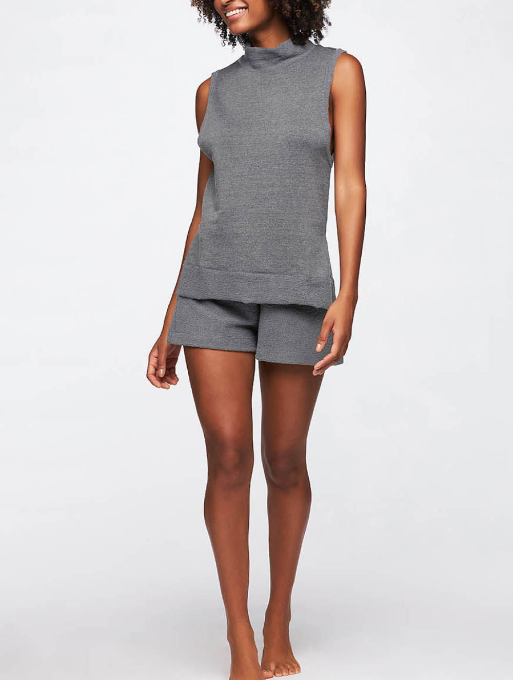 Regata em moletom mais estruturada , com moletom texturizado nos recortes da gola alta e no comprimento da barra. Possui recortes laterais e acabamento a fio nas cavas. Shorts em moletom texturizado com cós de rib com elástico, além do bolso na parte traseira da peça.