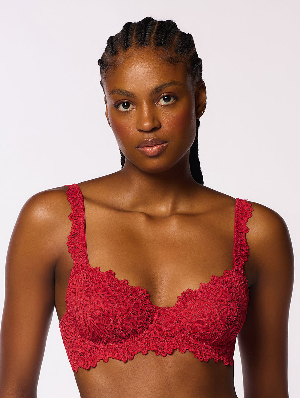 Sutiã leve com aro e sem bojo, confeccionado em renda exclusiva e forro de microfibra. Possui laterais mais largas com barbatana para maior sustentação e fecho nas costas. As alças na frente forradas de renda deixam a peça ainda mais especial.