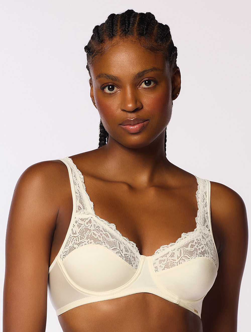 Sutiã leve com aro, sem bojo e com forro em microfibra. A peça possui recorte em renda vazada no busto e alças, meia alça com regulagem e fecho nas costas.