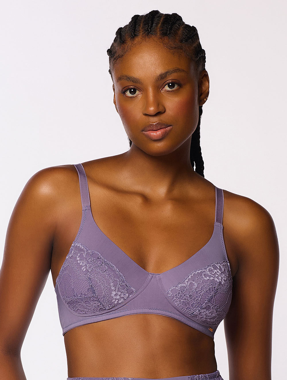 Sutiã estruturado, sem aro, busto com aplicação de renda e forro de algodão. Possui toda a parte inferior em microfibra, com alças e laterais largas. Alta sustentação
