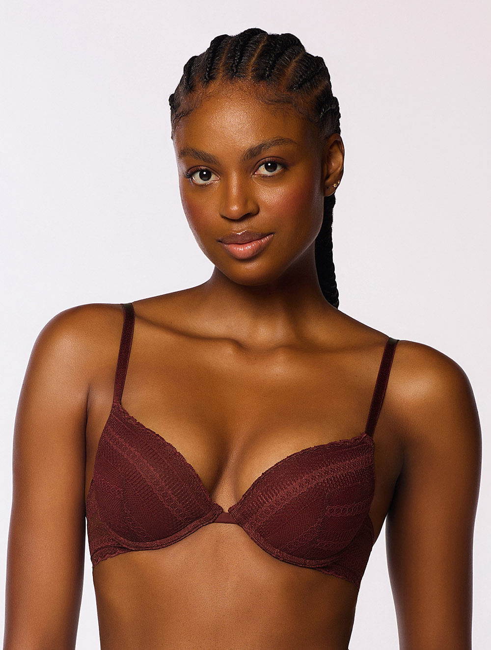 Sutiã push up com aro e bojo. Possui laterais em renda vazada, alças de elástico com regulagem e fecho nas costas. Sutiã aproxima e eleva os seios.