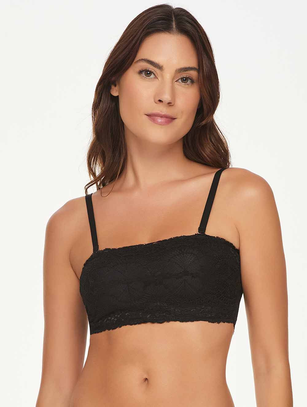 Top faixa em renda com forro em microfibra. Possui alças removíveis com regulagem nas costas.