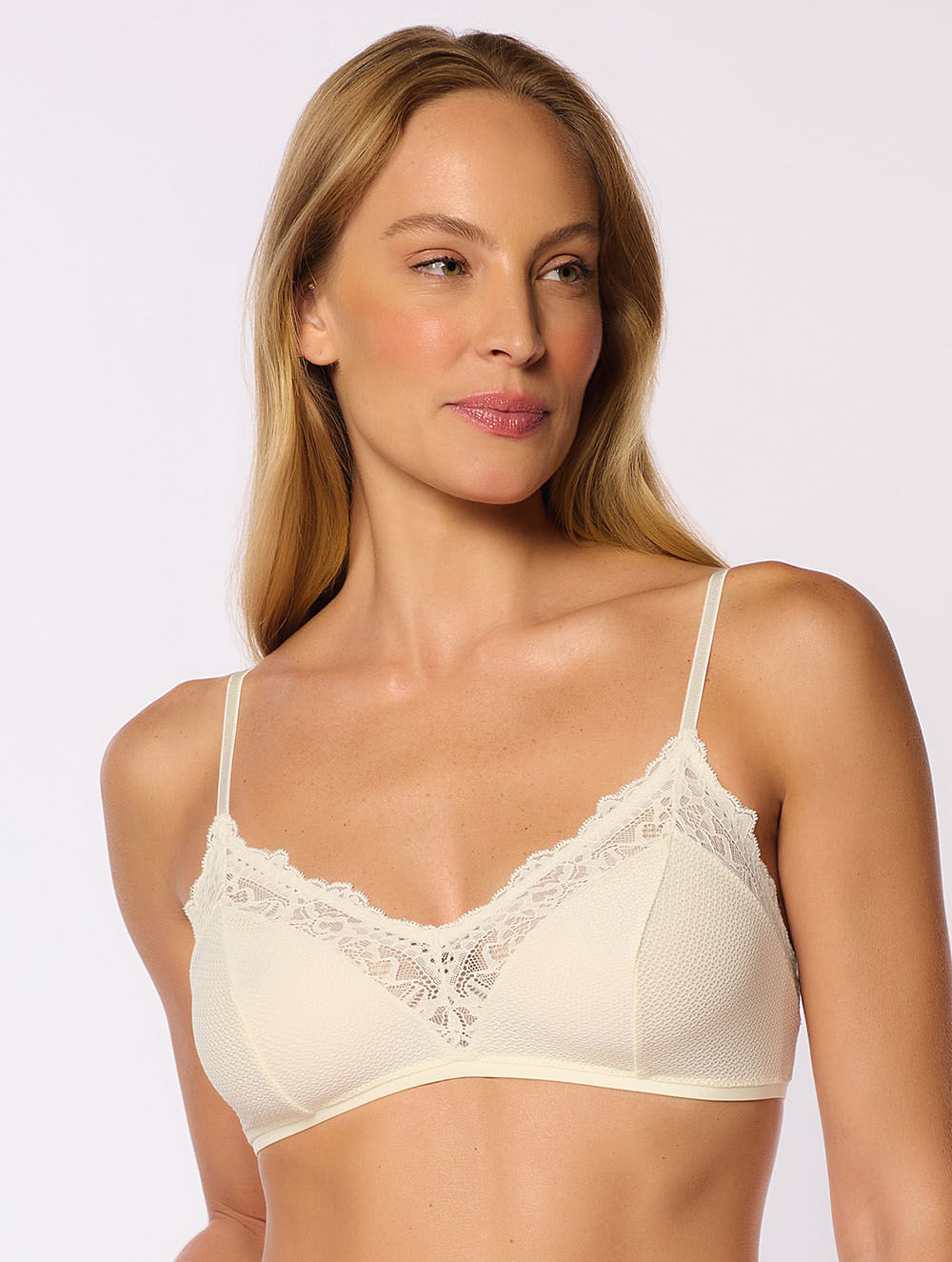 Top leve confeccionado em laise, sem forro, com recortes em renda vazada. A peça possui as costas mais estreitas e alças elásticas com regulagem.
