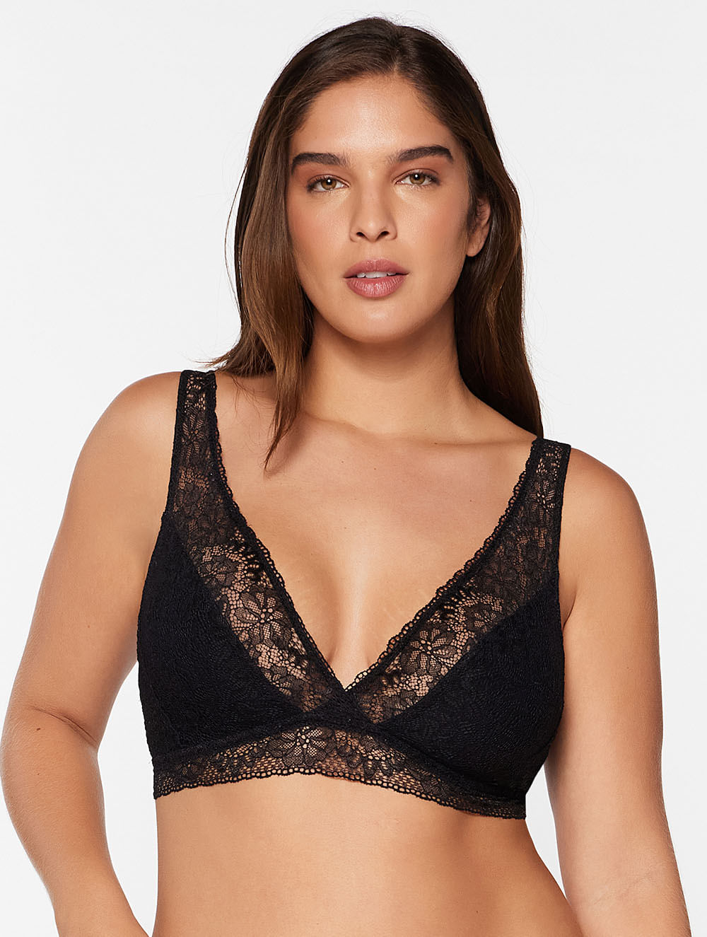 Top leve confeccionado em renda. O modelo possui forro em microfibra e alças com regulagem. Não possui fecho nas costas.