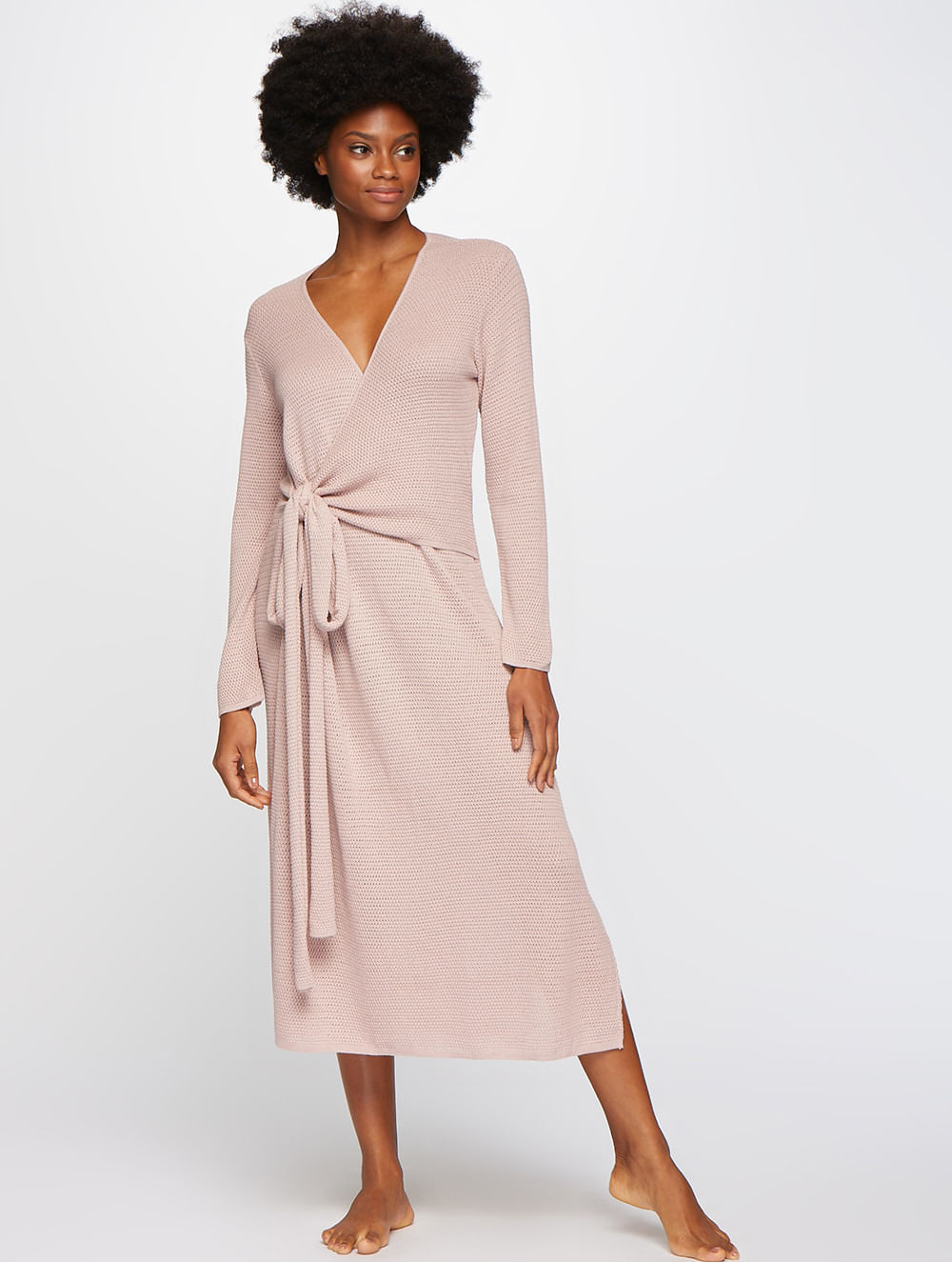 Vestido midi em tricot com mangas longas, amarração na cintura e fendas nas laterais.